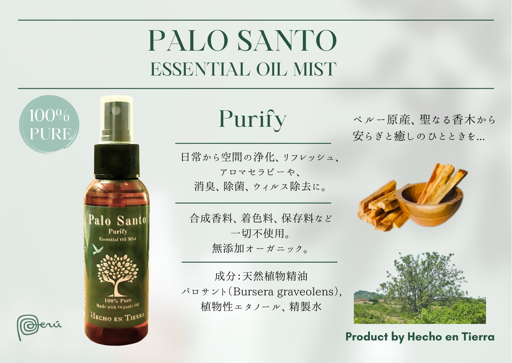 天然植物精油 パロサント(Bursera graveolens)、植物性発酵エタノール、精製水。